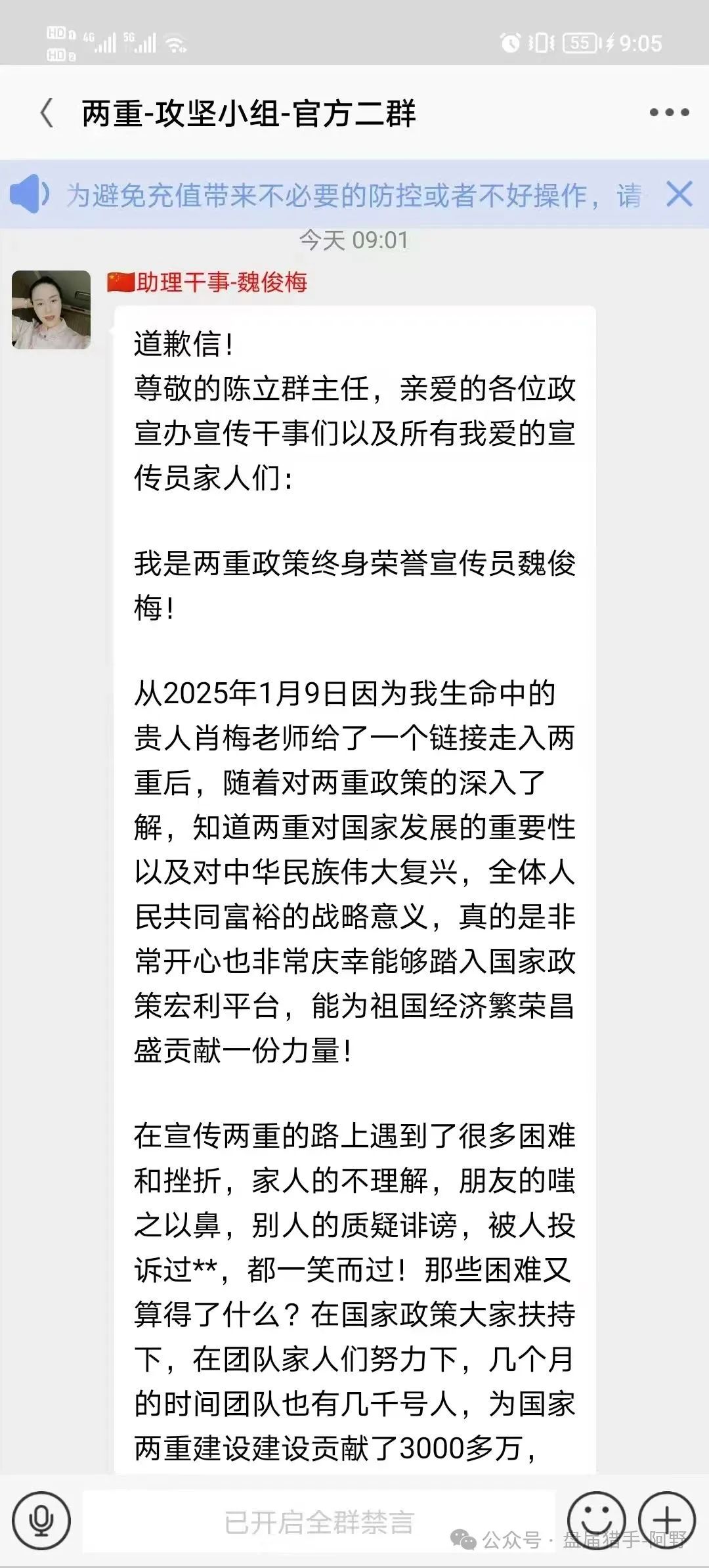 魏俊梅在“两重 - 攻坚小组 - 官方二群” 里演 “道歉信” 苦情戏!先说自己 “为国家贡献” 被误解,后装可怜称 “失去理智误导别纳税”,本质就是拖延时间、继续收割!等你发现提现不到账、账户冻结(平台说冻就冻 ),她就躲起来装死,把受害者当傻子耍!