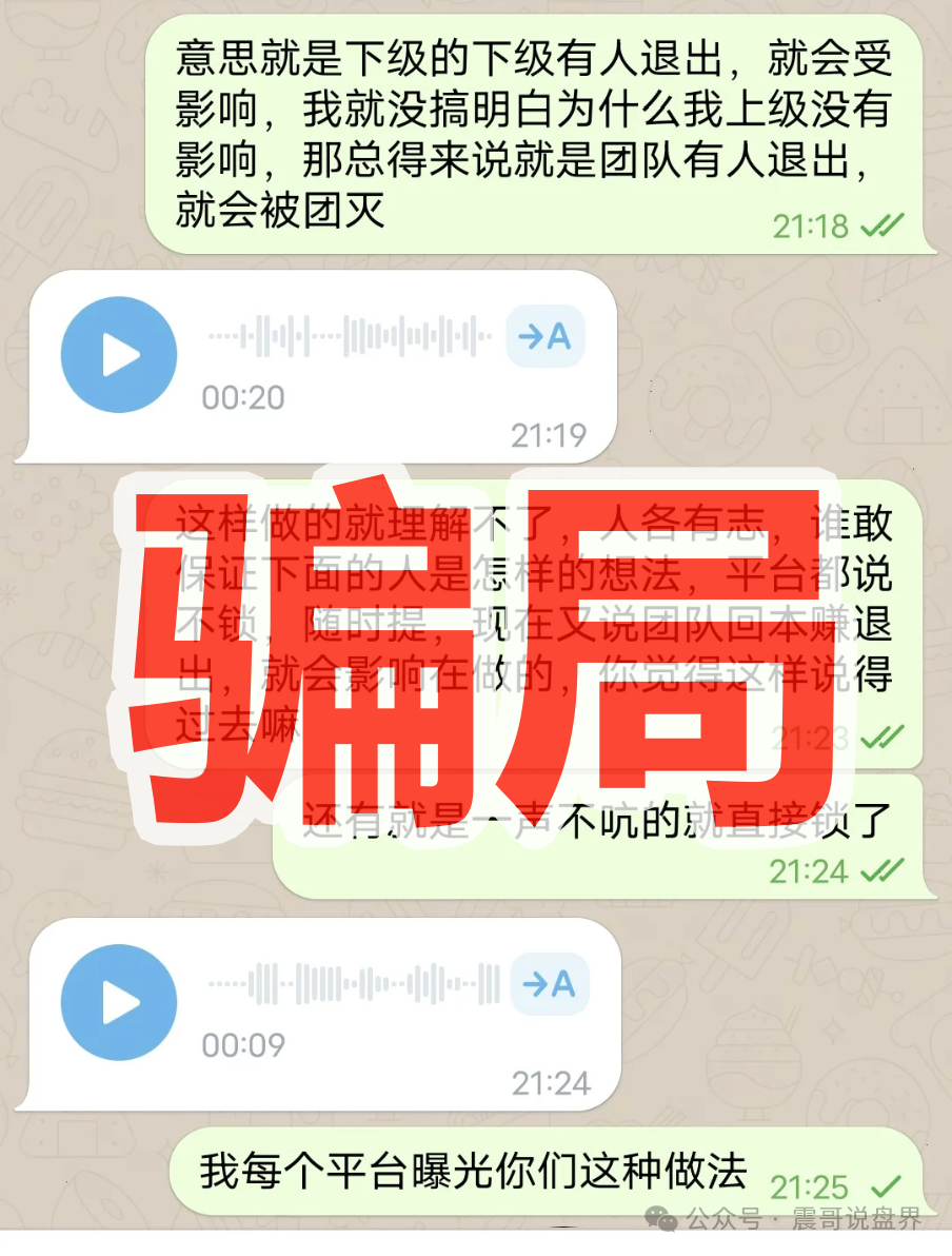 震哥看了下受害者提供的聊天记录,这伙人简直太嚣张了。说什么"团队不能有人退出",这不是明摆着要圈钱吗?现在好几个团队都被割了,账号封禁、群聊禁言,玩得够狠的啊!