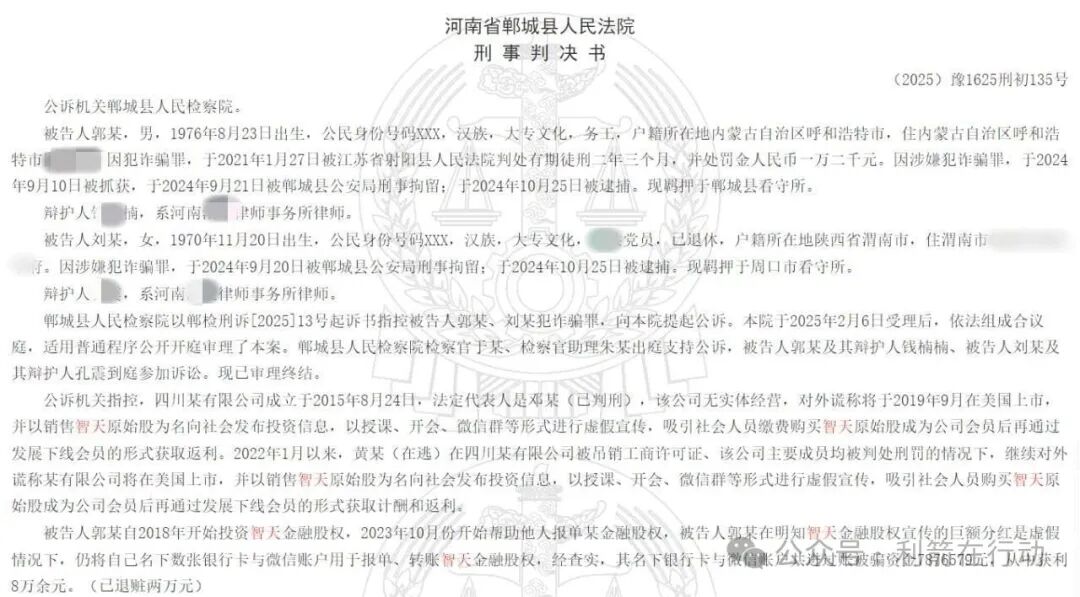 智天金融、智天原始股都是骗局,一骨干获刑4年,罚金2万元!