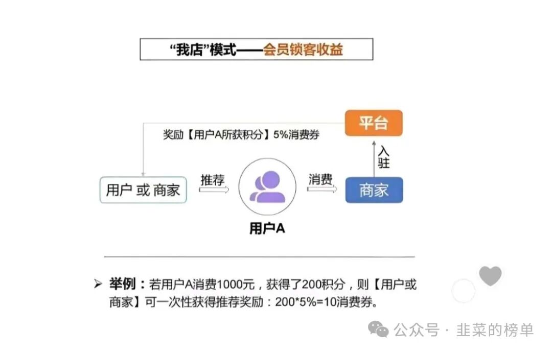 根据现有公开信息,“我店”模式的核心可以概括为:消/费者在合作商家消/费 → 商家让立(例如消/费额的15%) → 用户获得“绿色积纷” → 积纷可跨店抵扣、并可随时间“增值”(平台称为“长大”)→ 用户也可通过纷享蓷广获得奖励。