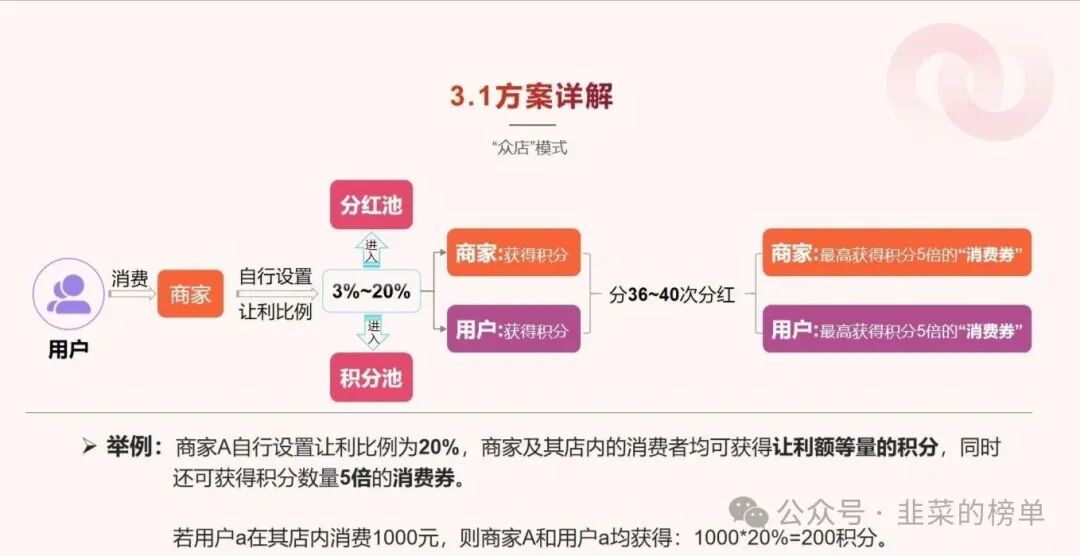 靠 “四维生态”(自营商城 + 社区超市 + 品牌专区 + 跨店联盟)攒了 200 万会员、2 万商户,流水破百亿。简单说就是 “积分连环局”:你花 50 块买桶油,商家从利润里让 3%-20%(比如 5 块)给平台,平台发 5 分 “绿色积分”;积分按规则慢慢兑抵用券,下次买东西能抵钱,攒多了还能转 —— 做得好的平台,积分 40 期(约 10 个月)能涨 5 倍,相当于 “慢慢返钱”。关键是:积分价值全靠 “真买真卖” 撑着,没实际消费,积分就是张废纸。