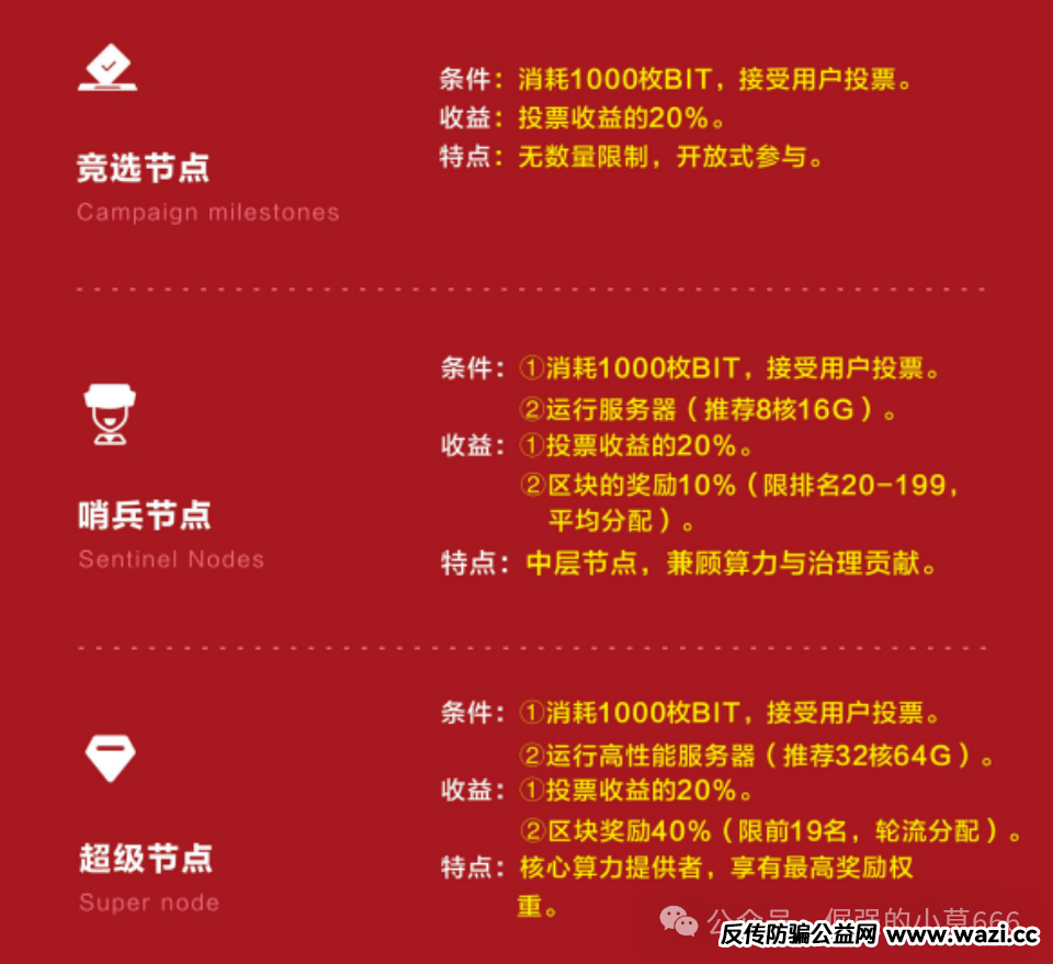 二是节点等级制度暗藏拉新压力。项目设置三类节点,均需质押1000枚BIT才能参与。从“备选节点”到“超级节点”,等级越高,所需投入越大,拉人头带来的分红也越多。尤其是“超级节点”全网仅19个,竞争激烈,迫使参与者不断拉人、加大投入,形成典型的层级裂变结构。