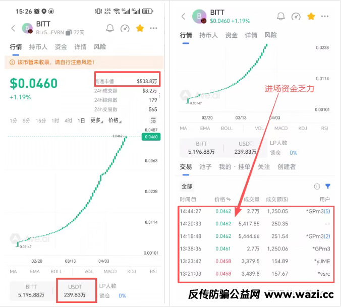 最致命的风险来自链上数据。当前BIT的流通市值为500万U,意味着用户投入的本息总额已达此规模,但底池资金仅有240万U,资金覆盖率不足48%。换句话说,若所有用户同时提现,平台连一半的兑付能力都不具备。这种严重资不抵债的状态,正是庞氏骗局即将崩盘的明确信号。