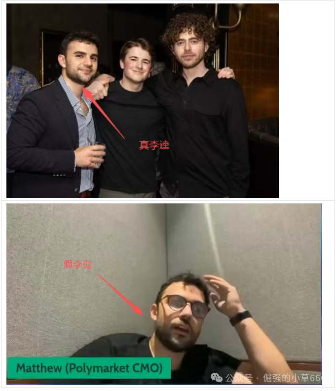 为了增加可信度,该项目雇佣演员冒充 Polymarket 的首席营销官 Matthew Modabber。真正的 Matthew Modabber 是拥有意大利和波斯血统的纽约人,年轻有为,曾担任社交应用 BeReal 的增长经理。而骗局中的“高管”不仅长相、血统完全不符,其言行举止也漏洞百出。这种低劣的伪装,利用了部分投资者不愿花时间核实信息的惰性心理。