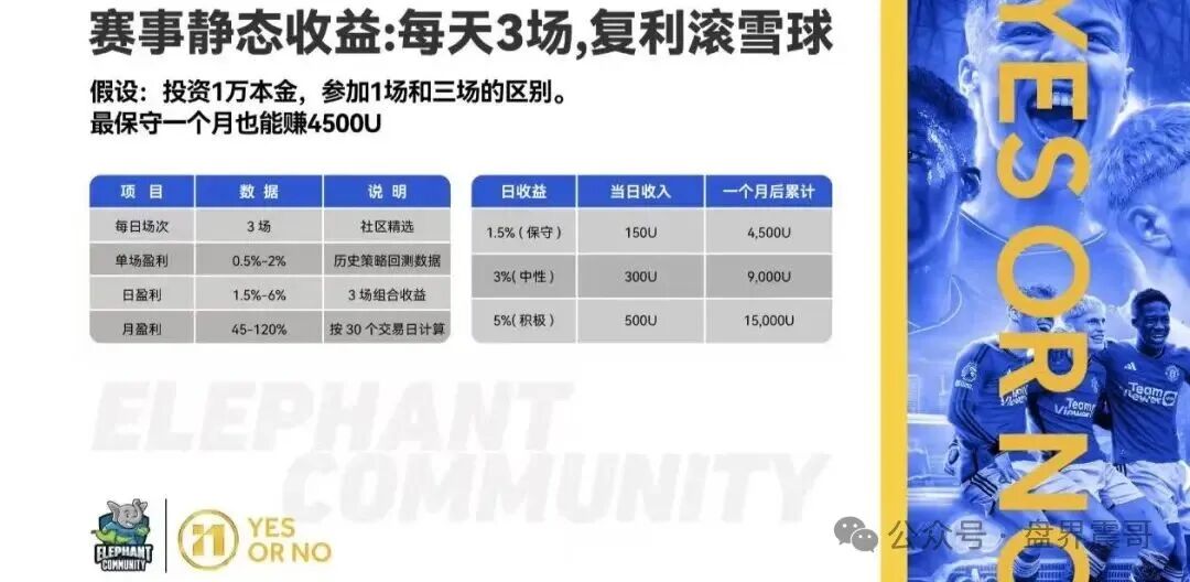 最近一个叫“大象社区”的项目在网络上疯狂刷屏,打着“让足球预测成为科学”的旗号,声称依托Web3平台YesorNo,有EXOR集团背书,宣称月收益高达120%,还能通过拉人头实现“被动收入”