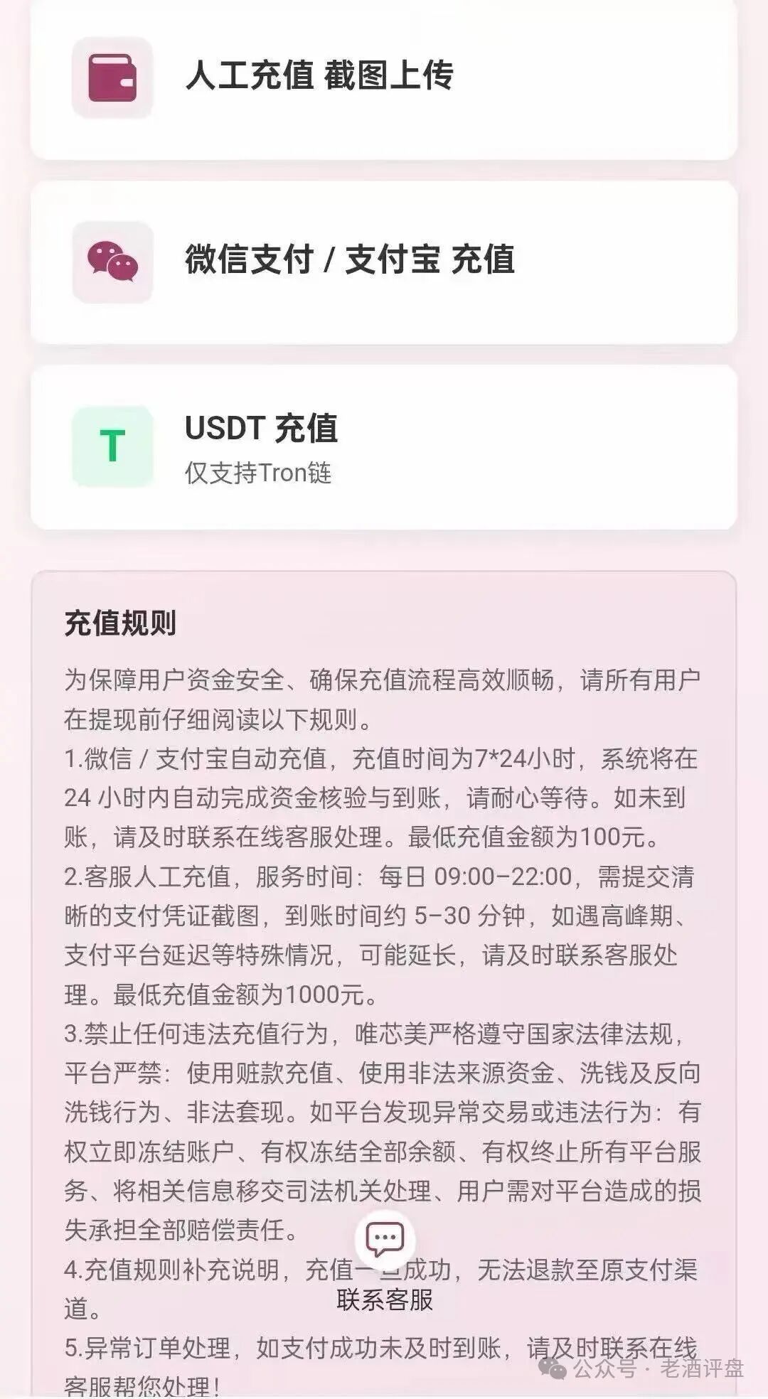 再看充值环节,平台不仅支持微信、支付宝充值,还开放了USDT虚拟币通道,同时明确标注“充值成功无法退款”。这意味着你的钱一旦打过去,就直接进入了平台的私人口袋,没有任何第三方监管,随时可能被冻结账户、拒绝提现。不少受害者反馈,前期小额分红能正常到账,一旦投入大额资金,平台就会以“流水不够”“违规操作”为由冻结账户,本金和收益全部打水漂。
